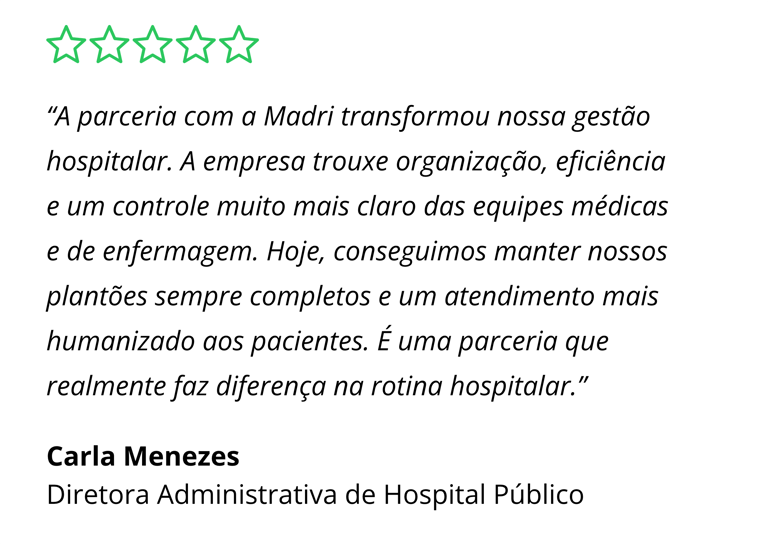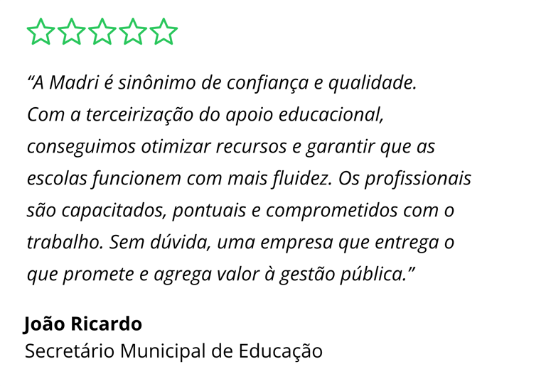 A Madri é especializada na terceirização de serviços de apoio (atividades-meio) e serviços finalísticos, oferecendo soluções completas para órgãos públicos e empresas privadas. Atuamos com eficiência, qualidade e conformidade legal, contribuindo para a otimização de recursos e melhoria da gestão operacional.